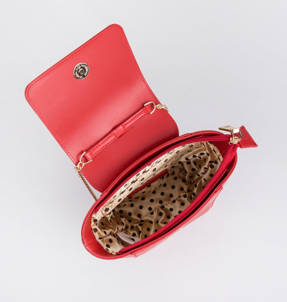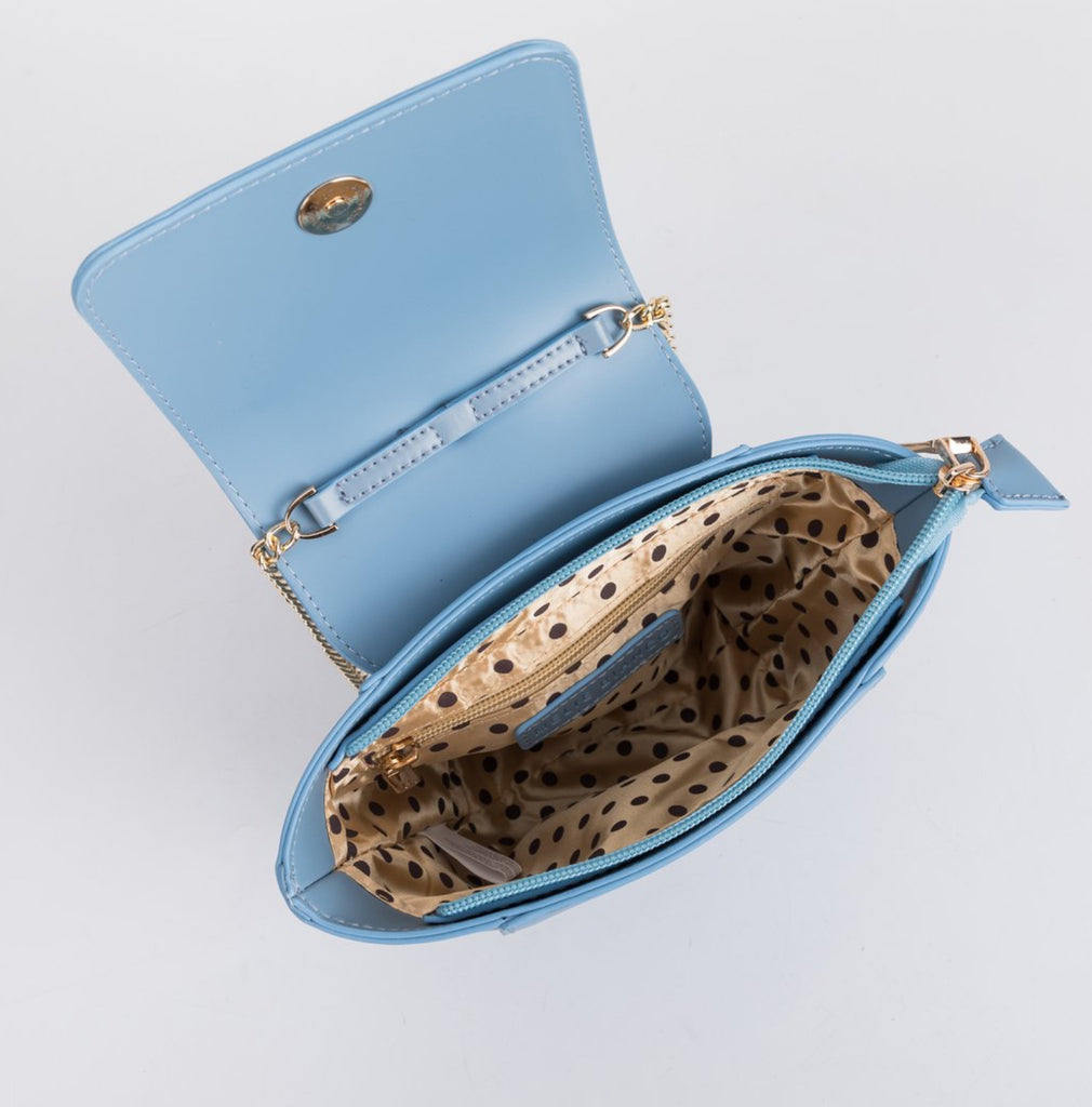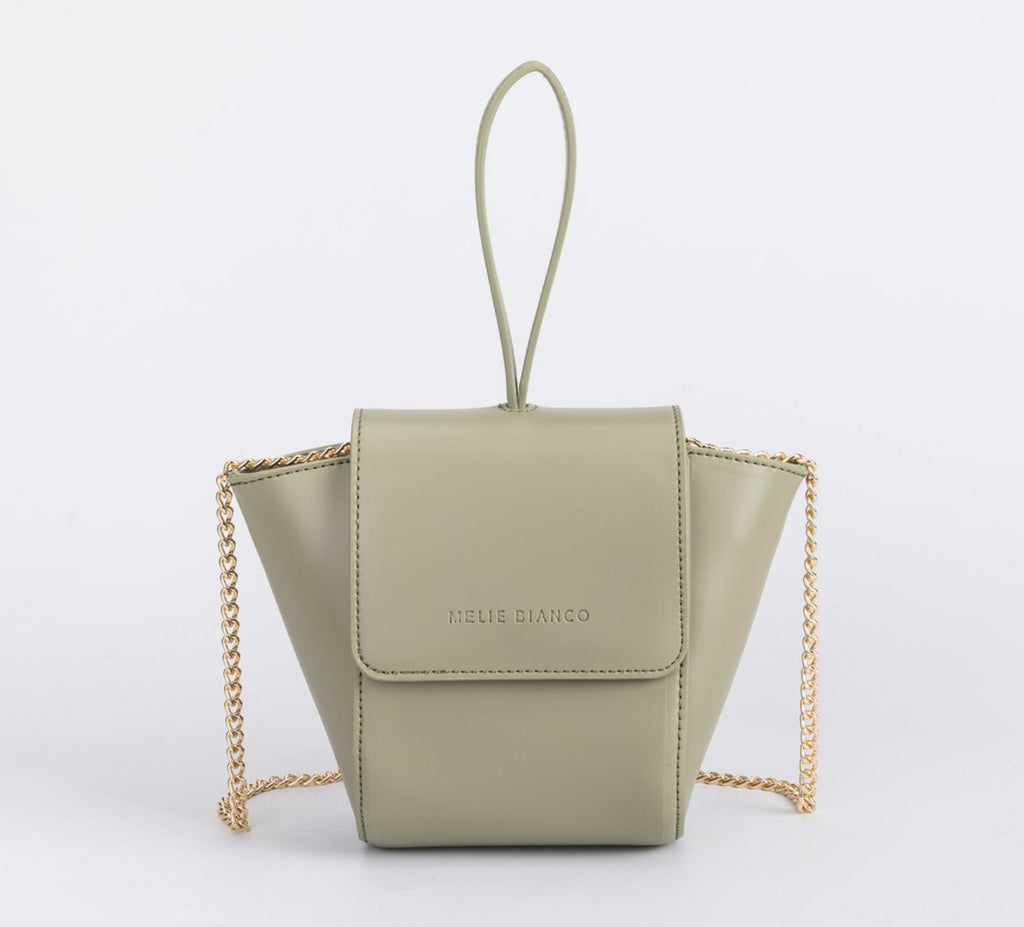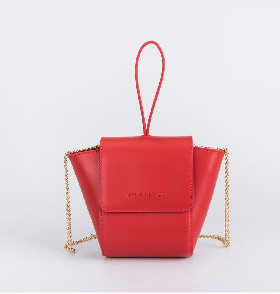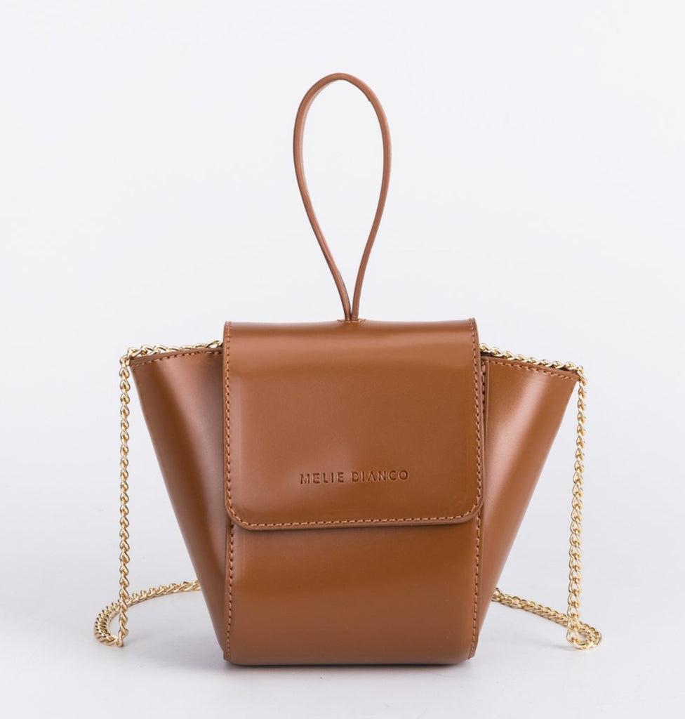 PETA approved and a bestseller, the Adele is a handheld icon. With two different straps you can hold it by hand, as a wristlet, or a crossbody by using the gold chain and semi gloss vegan leather shoulder strap. This bag is lined with the Melie Bianco Signature polka dots and features an inner zipper pocket.