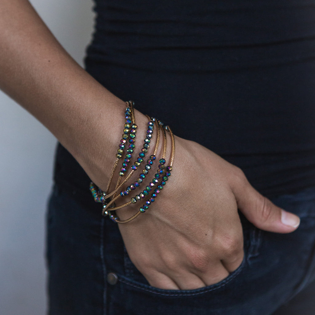 The Scout Wrap is made with crystal beads and etched metal findings. It can be worn wrapped 6-7 times for a bracelet and 1-3 times for a necklace. Displayed on beautiful cards and personalized with inspiring quotes they make a great gift!