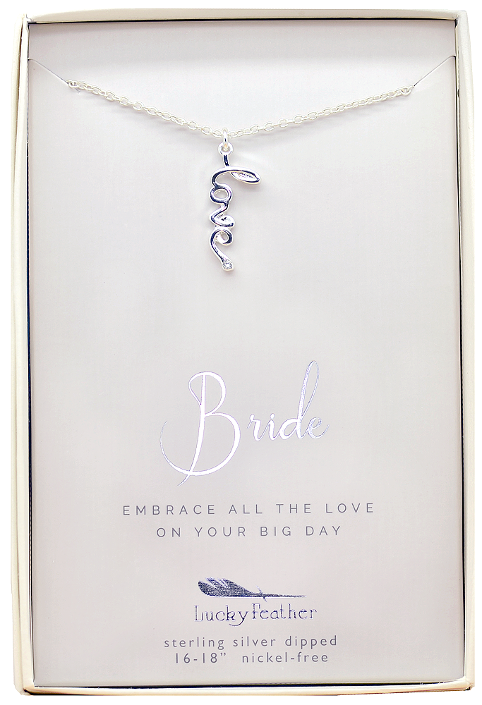 Surprise the bride with a sweet "embrace all the love on your big day" message and this gorgeous "love" pendant necklace! She's going to L-O-V-E it beause everyone enjoys a little sparkle. This sterling silver dipped 16-18" adjustable necklace features a crystal stone accent and arrives in a beautiful gift box with embossed silver foiling.
